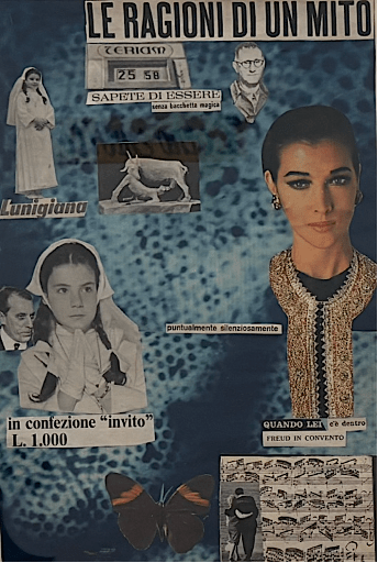 La Rocca’s collage work Le Ragioni di un Mito (The Roots of a Myth) incorporates metaphor and vague allusion through the semantic ambiguity between image and text. For example, a magazine cutout image of a girl praying is placed above the text reading: “In confezione invito L. 1000” (“in invitation package for a price of 1000 lire”), turning an image of sacred piety into a commodified object that “invites attention”. This is likely a pun on ‘invito alla confessione’ – ‘invitation to confession’ – turning the mirror to society, poking at the remnants of heightened religiosity of the 60s-70s along the ubiquitous sexualisation and objectification of women.