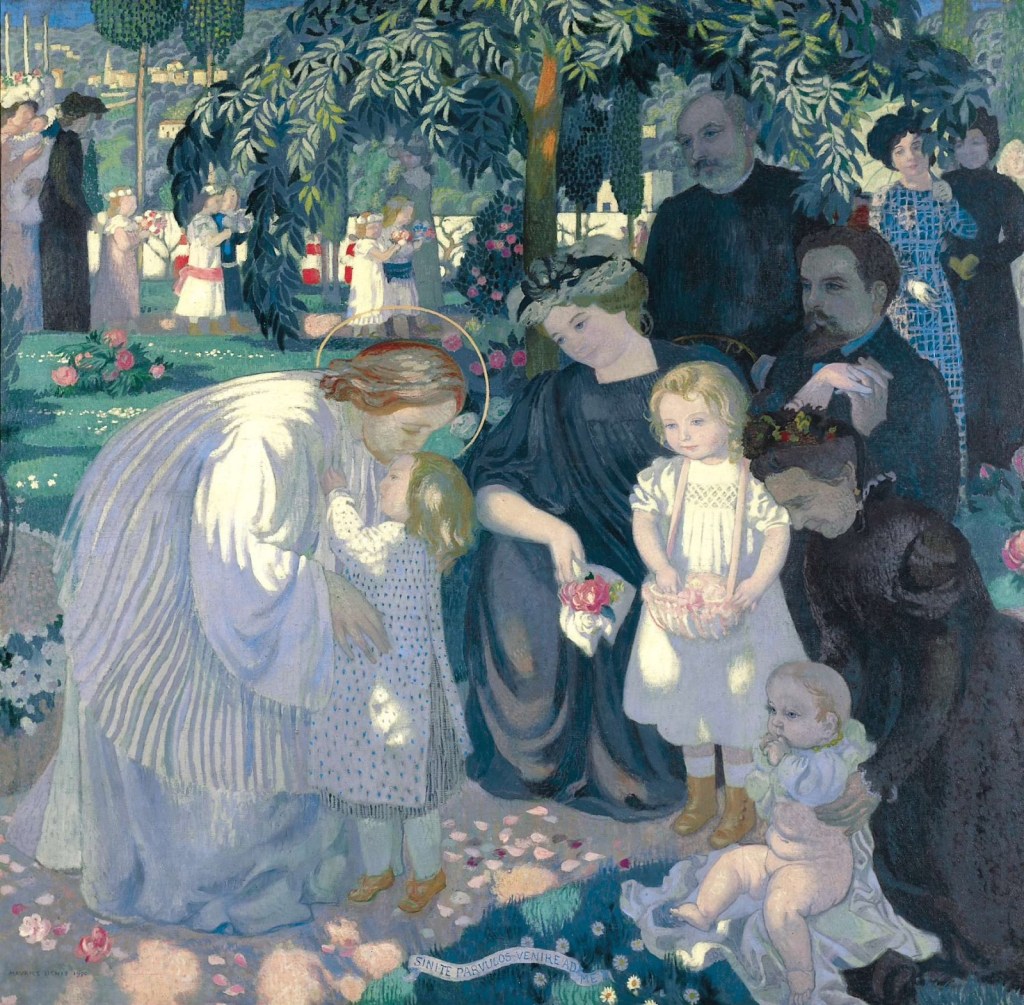 I have to be a Christian painter, I have to celebrate all the miracles of Christianity, I feel I have to’ – The enchantment with New Testament narratives most likely follows from the profound religiosity of the artist’s family. In Let the Children Come to Me, the trembling chiaroscuro looks like it is casted by the flame of church candles, and the slight mist that hangs in the painting feels lifted by the thick, mingled incense smoke. In a monastery garden in his hometown Saint-Germain-en-Laye, Denis kneels before Christ. By giving Jesus features of a familiar presence, he translates the sacred ritual of First Communion into the realm of the domestic, drawing a scene from Scripture into the family circle.