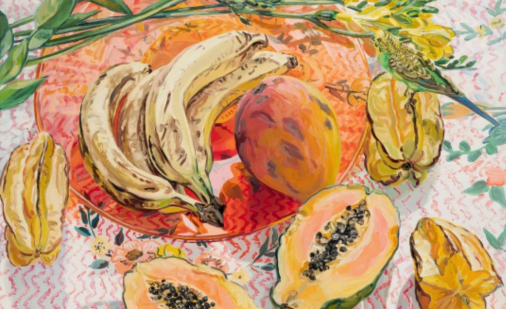 Organised across the Masterworks Butterfield and Mezzanine Galleries, ‘Place in Time’ immerses the visitor in Fish’s richly coloured canvases, many of which feature dense, layered arrangements of objects, colourful textiles, tropical fruits, flowers and shells, that exude both visual energy and spatial complexity. The exhibition foregrounds the interplay between Fish’s memories of Bermuda and her mature artistic practice, inviting viewers to consider how the island’s dense light and layered environment reappear across her compositions. This connection between place and picture plane becomes especially compelling in works where tropical surfaces catch, reflect and refract light, creating dynamic resonances that seem to echo Bermuda’s chromatic landscape even decades after she left the island to study and work in the United States.