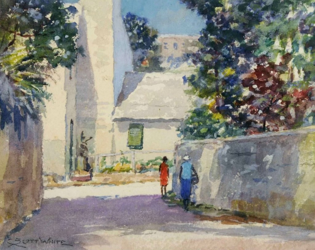 Painted en plein air, these works register a slower rhythm of life and a pictorial language shaped by direct engagement with sunlight and environment. The warm glow of a late afternoon in Will Howe Foote’s ‘Old Bermuda House’ contrasts with the bright turquoise vibrancy of Stanley Pierpont’s ‘Bathers on Bermuda Beach’, illustrating a shared fascination with how colour and light interact in different contexts. Sea, sky and built environment emerge not as static backdrops but as dynamic partners in a visual narrative that rewards careful looking. The exhibition also offers moments of quiet respite, such as Clarence Scott White’s ‘St. George’s’, where soft shadows and sun-dappled streets evoke a contemplative sense of place anchored in everyday life.