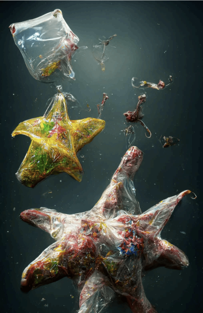 Take Indian designer and artist Amith Venkataramaiah, who uses the generative AI programme Midjourney to create images of a potential future where marine life fuses with plastic waste to survive in our polluted oceans. An example of this is his 2022 work Starfish 2. However, though its underlying message is certainly pertinent in today’s world, it somehow lacks a sense of urgency or any deep emotional impact.