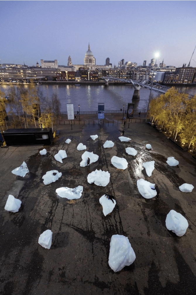 Compare this to Olafur Eliasson’s Ice Watch, where ice blocks from Greenland were brought to London to form a temporary sculpture that slowly melted before the viewers’ eyes. On the surface, these works of art are similar, both completed by contemporary artists who aim to raise awareness for climate change. They differ with how impactful Ice Watch is for the viewers, who are there to witness the ice melt away.