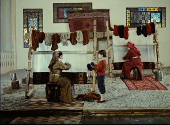 Unsurprisingly, the concept of ‘tapestry’ is central to the story, with the film following the life of an infamous Armenian troubadour, Sayat Nova, whose parents were weavers. We first encounter this craft during the poet’s childhood. In this initial scene (fig. 1) the perspective is flattened, the simple cream-coloured room is decorated only with a few stained-glass windows, under which two peg looms stand parallel to each other. Two adult figures are sat weaving, turning loose masses of yarn into organised geometric patterns, while little Nova brings the yarn to one of them. The carpets (shown to be complete later in the film) are only starting to emerge, suggesting the very beginning of Sayat Nova’s life.