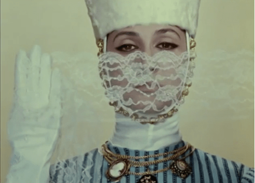In the troubadour’s youth scenes, the lace and vibrant textiles help construct a medieval setting, this is especially evident in the choice of white lace held by Princess Anna in the courtship scene. Alluring, soft, pure, and feminine, it moves down her face to the lips, revealing her drooped eyelids and her sensuous yet morose gaze. This exacerbates the sexual tension between the two young lovers, and hints at the forbidden nature of their romance.