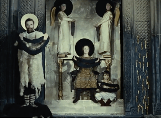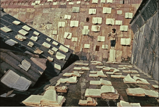 Another childhood scene depicts the poet at the top of a monastery; the roof is filled with rare manuscripts, and their old brittle pages are seen turning under a light breeze. While Nova is shown to be flipping through one book, he metaphorically studies all of them. The scene thus transcends traditional boundaries of time, capturing the boy’s adolescent experiences at the seminary. Observing both scenes, one may discern a semantic comparison between the word in the manuscripts and the thread of the loom; both are tied together with the rest to form a greater meaning, and both are continuous. In this way, language is like a carpet: weaved, formed and reformed throughout the poet’s life — it can be something that brings us closer to other people, even the ones who are separated from us by thousands of years. Parajanov highlights this by stating that “We are recounting the epoch, the people, their passions and thoughts through the conventional, but unusually precise language of things.”