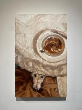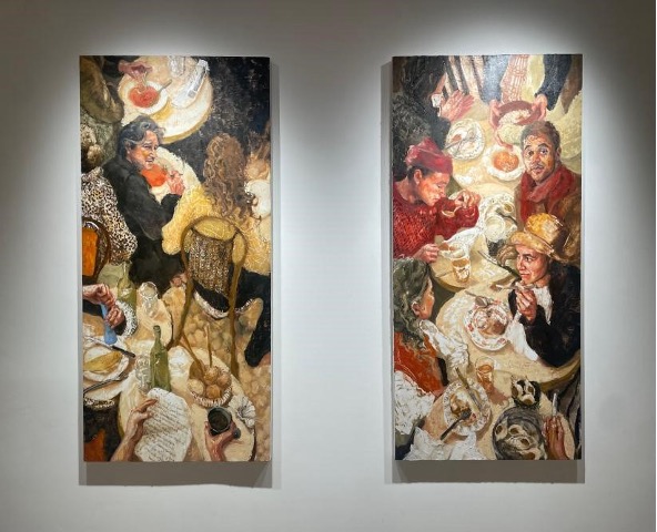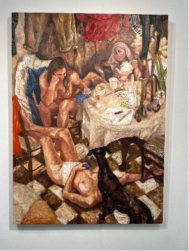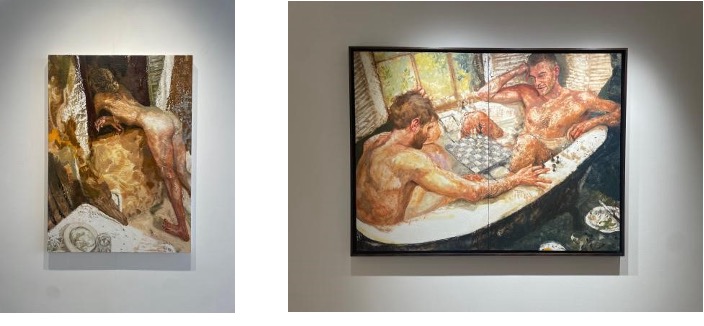 Ponsonby’s “A Warm Life Through Butter” invites us to share a dinner with friends, a chess game in the bathtub, breakfast in the garden or a naked peek through the window. The exhibition title is a reference to Ponsonby’s preferred method of work: the artist mixes her paint with beeswax to render her scenes “through butter”, amplifying the naturalism of texture in skin, food, fabric and liquid. She scratches through the surface of her materials, making figures seem almost carved and rendered three-dimensionally out of wax. Her cramped and chaotic compositions distort perspective to include the viewer in the shenanigans of her subjects. Gazes turn towards us, imploring us to join the conversation; suddenly strangers’ faces begin to feel familiar. The distinct intimacy with which Ponsonby imbues in her scenes makes one feel as though we were meant to be right where they are. Her artworks appeal to all of one’s senses: you can almost taste the wine, crave the butter, feel the chess pieces or warm bathwater between your fingers, smell the onion, the tomato, and soap, hear the “chiacchierata” of old friends over a wholesome meal at an Italian restaurant.