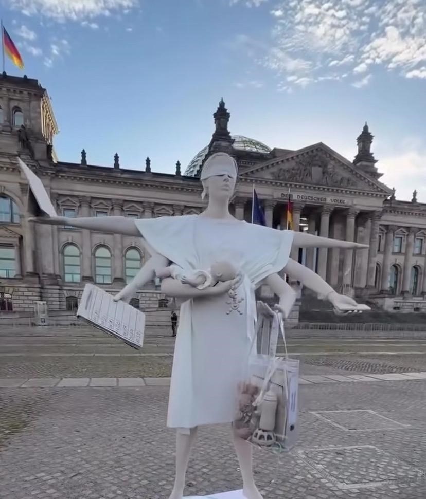 Works that celebrate women as empowered beings challenge this normalisation of misogyny. A powerful example is Stefanie Hidicki’s Pregnant Themis which was unveiled just a few weeks ago. The figure, being the Greek Goddess of Justice, holds a baby, laptop, calendar, bag, phone, and scales — stands in prime position outside the German parliament, Bundestag. Supported by the Mutterschutz für Alle! (Maternity Leave for All) initiative, it represents the silenced burden faced by working mothers in a society with inadequate infrastructures to help them. It makes a potent political statement that, whilst women are strong and independent, society has a responsibility to support them, starting with the fact that maternity leave should not just be a privilege but a basic right. Its location at the political epicentre of Berlin functions as a subversion of what we expect to see in the public sphere, and roots ideas of maternity as central to national identity and social and political discourse.
