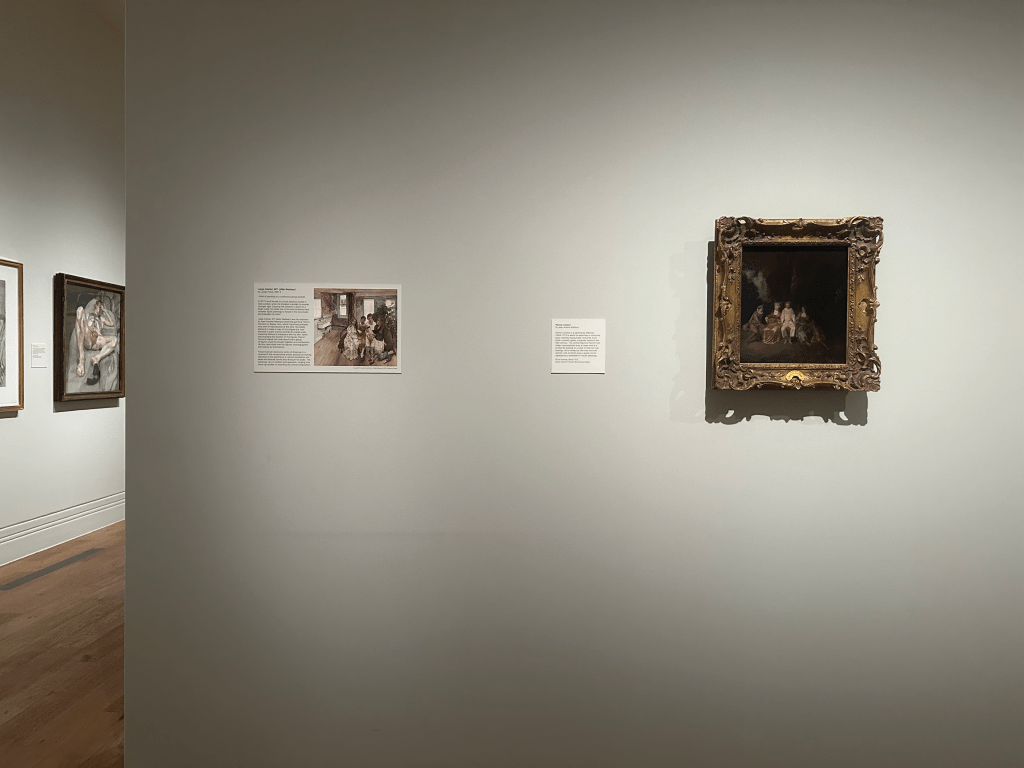 As we moved through the exhibition, we were told about the process and difficulties involved in securing the paintings of influential artists such as Lucian Freud, whose works are spread across the globe in public and private collections. Thanks to the National Portrait Gallery’s long-standing relationship with Freud during his lifetime, most of the works were successfully gathered in one space for what is considered the biggest retrospective of the artist. Yet it would be naive to assume that everything went smoothly. The gallery was unable to secure Large Interior, W11 (after Watteau), or more colloquially known as “Celia, Bella, Suzy and Kai: A Family Portrait,” which was sold at Christie’s to a private collection. In many cases, this painting would have been excluded from the exhibition, or, at best, described in the curatorial text. Typically, it would not have been included in the show’s narrative. However, the painting was actually there, but in the form of a reproduction, accompanied by text.
