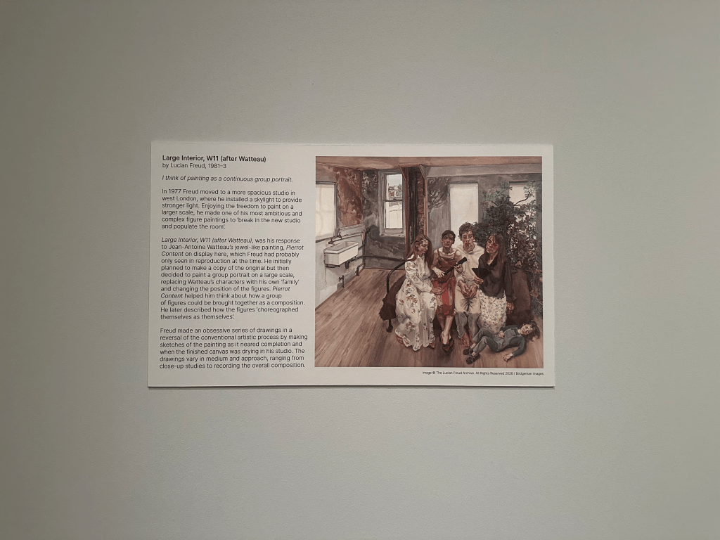 The absence of the painting also makes visible the art market’s role in shaping public access to art, as well as in creating narratives in the viewer’s mind. As it happened with Large Interior, W11 (after Watteau), the acquisition of the work by a private collector removes it from public view, sometimes completely. The absence of this painting from Freud’s exhibition raises an important question: who has the right to see certain artworks and under which conditions?