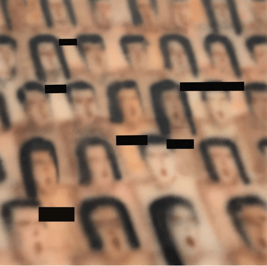 Gao’s work examines the very real diminishment of the human subject in an age of cyber-everything. It feels like the digital is consuming the physical world and disrupting it. The tangibility of the physical body becomes a danger and a possibility for exploitation. This danger, in relation to our growing reliance on technology, is evident in the racial bias of facial recognition technology. Studies (from the University of Sussex and the federal government in the USA) have shown technical inaccuracies in facial recognition that worsen on African and Asian faces. Here in the UK, the home secretary Shabana Mahmood was recently criticised for comparing the panopticon to her plans for the British criminal justice system; she even specified that AI will be the instrumental technology for this. Many associate the panopticon with a heavily dystopian form of surveillance. In truth, it is a design of in-built control used specifically for prisons. The way in which society treats prisoners is highly dehumanising, and the prison system itself is flawed, but to extend this dehumanisation to the British public is a great risk. Gao also dehumanises his subjects. As we look at his work, we can attempt to imagine the person behind it. In some of his works, he alludes to the very physical reality (which we cannot reach) through the cubist shapes beneath the blur. They are sharp, geometric and still abstracted, but they feel more tangible. In ‘Your Children Are Protected’, this 3D figure is no longer rendered. Instead, there is a mass of figures (whom we can assume are children) whose orderly position suggests almost a militaristic rigidity. They are also nude, which should make the viewer feel somewhat uncomfortable. Both choices by the artists convince the viewer of a sentiment that opposes the title: the children are not safe; they are instead positioned as products. Dehumanised, arranged and vulnerable, we, as the audience, become the surveyor; it is almost as though our viewership makes them unprotected.