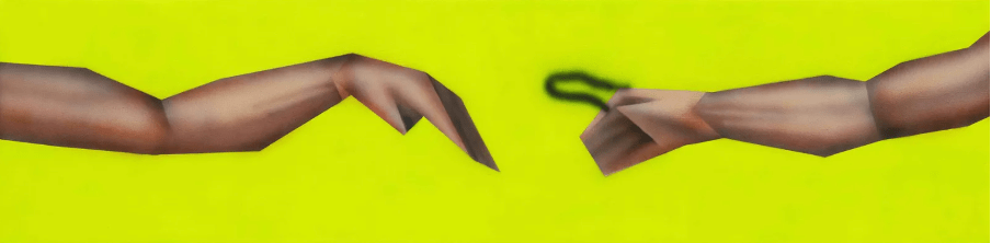 Russell posits that we are not opaque, but that the body is translucent, liminal, and immaterial. These descriptions are often used to describe modern technology (most often today, artificial intelligence) ideas, such as the “cloud” and “streaming” contribute to an ephemeral image, allowing us to remove the very real and very human consequences of technology from its popular association. Chinese American artist Hang Gao’s work flips the argument of glitch-feminism, showing technology as more tangible than metaphysical. His canvases display the aesthetic of 2000’s video game glitches, where we see the figures in a state that pre-empts their final conception, in their immateriality, they pose as perfect metaphors for our relationship with technology today.