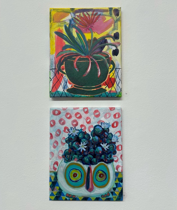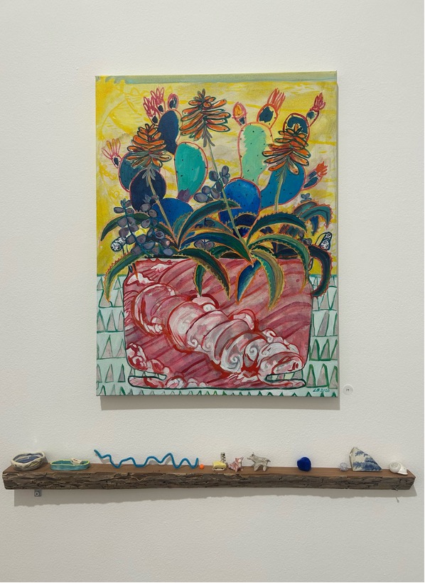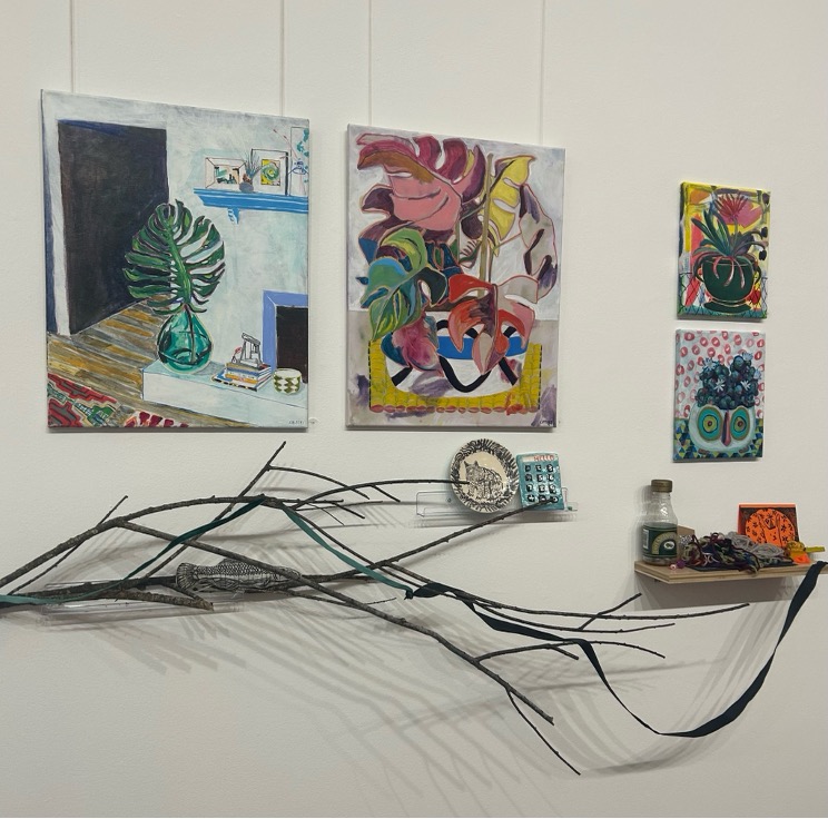 Yet, A Personal Ecology is not confined to the painted surface. One of its defining qualities is the way it extends painting into space through a curated constellation of objects: ceramic objects, branches, found materials, and small sculptural presences are arranged across wooden shelving. The relationship between these pieces creates a sense of play and a visual fluency, as if the paintings and objects come from the same lush, organic universe that the viewer becomes privy to through the exhibition.